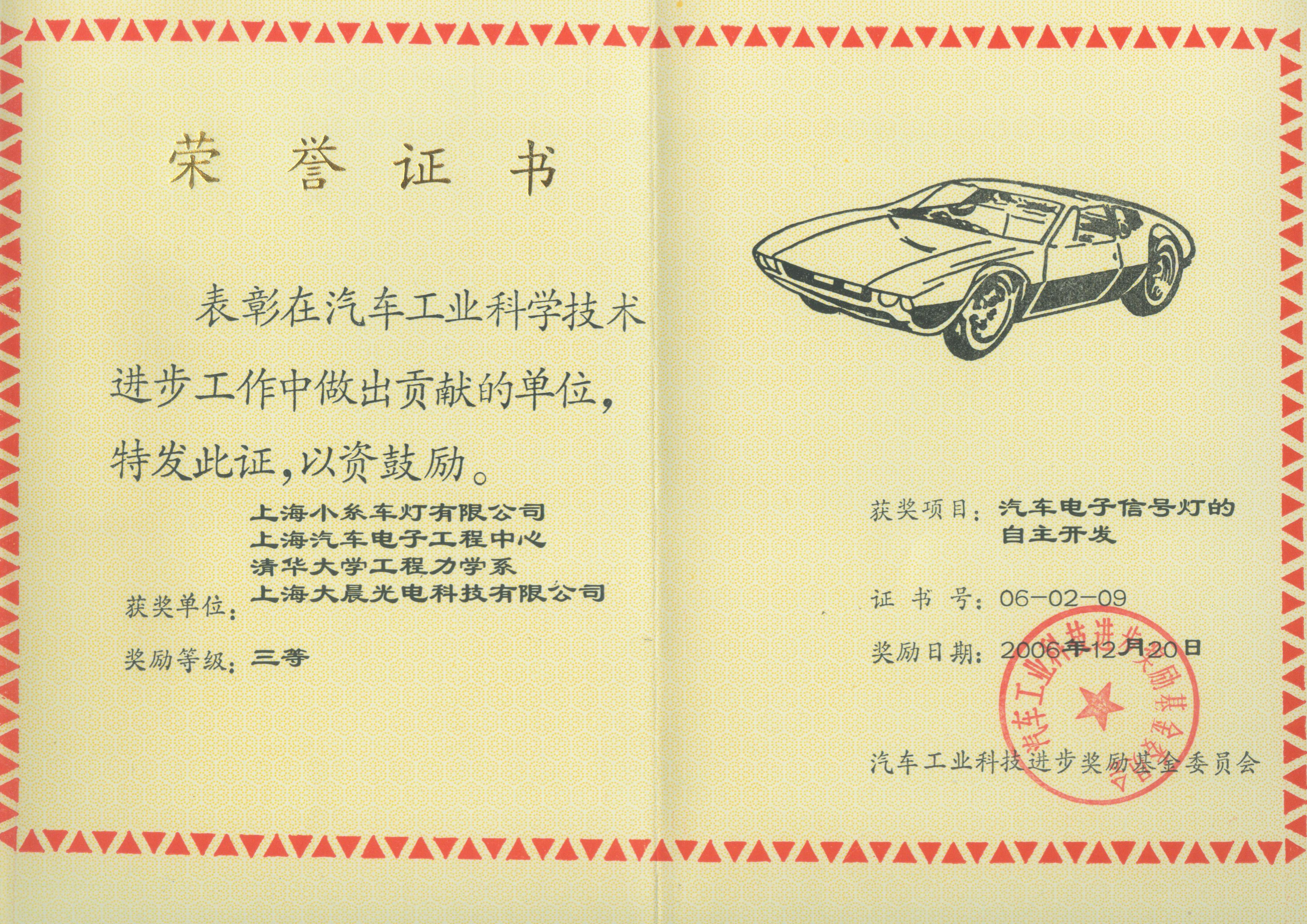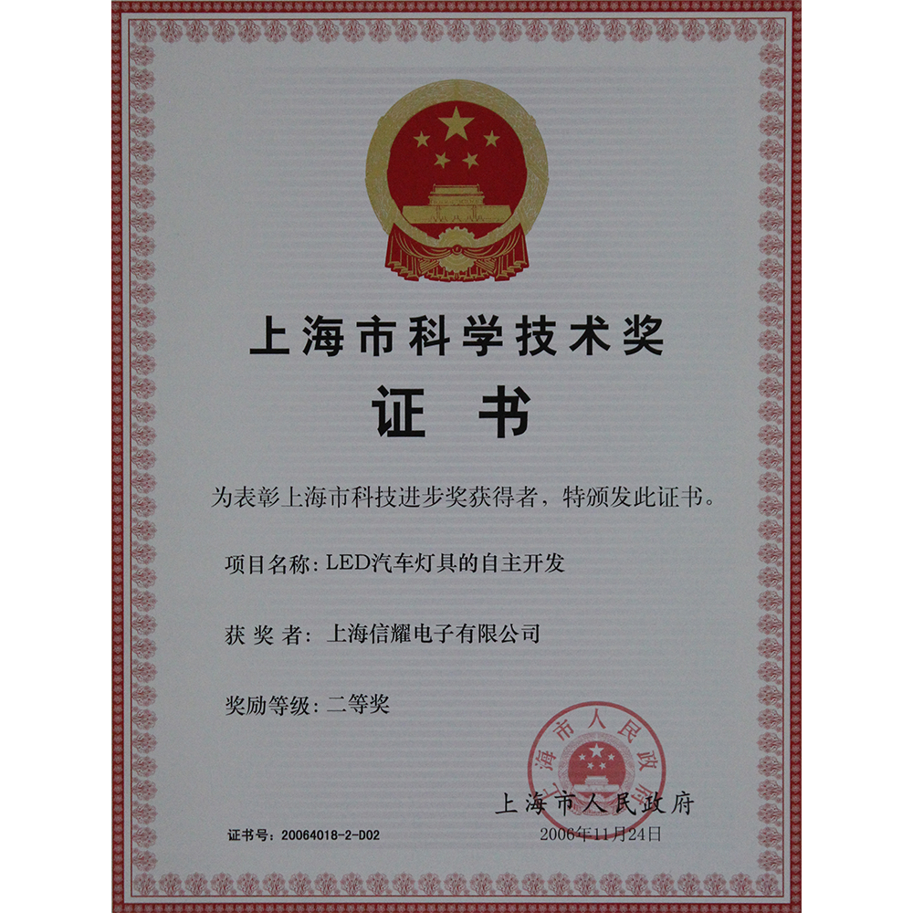 自2004年起,公司連續被認定為“上海市高新技術企業”,2019年被評定為“上海市市級企業技術中心”,連續多年獲得嘉定區先進制造業綜合實力獎金獎,2020年榮獲“上海市和諧勞動關系達標企業”稱號,2023年榮獲“上海市專精特新中小企業”。公司參加完成多項國家及上海市科技項目,其中“LED汽車燈具的自主研發”項目獲得市科技進步二等獎,“汽車電子信號燈的自主開發”獲得“汽車工業科技進步獎勵基金委員會”三等獎。